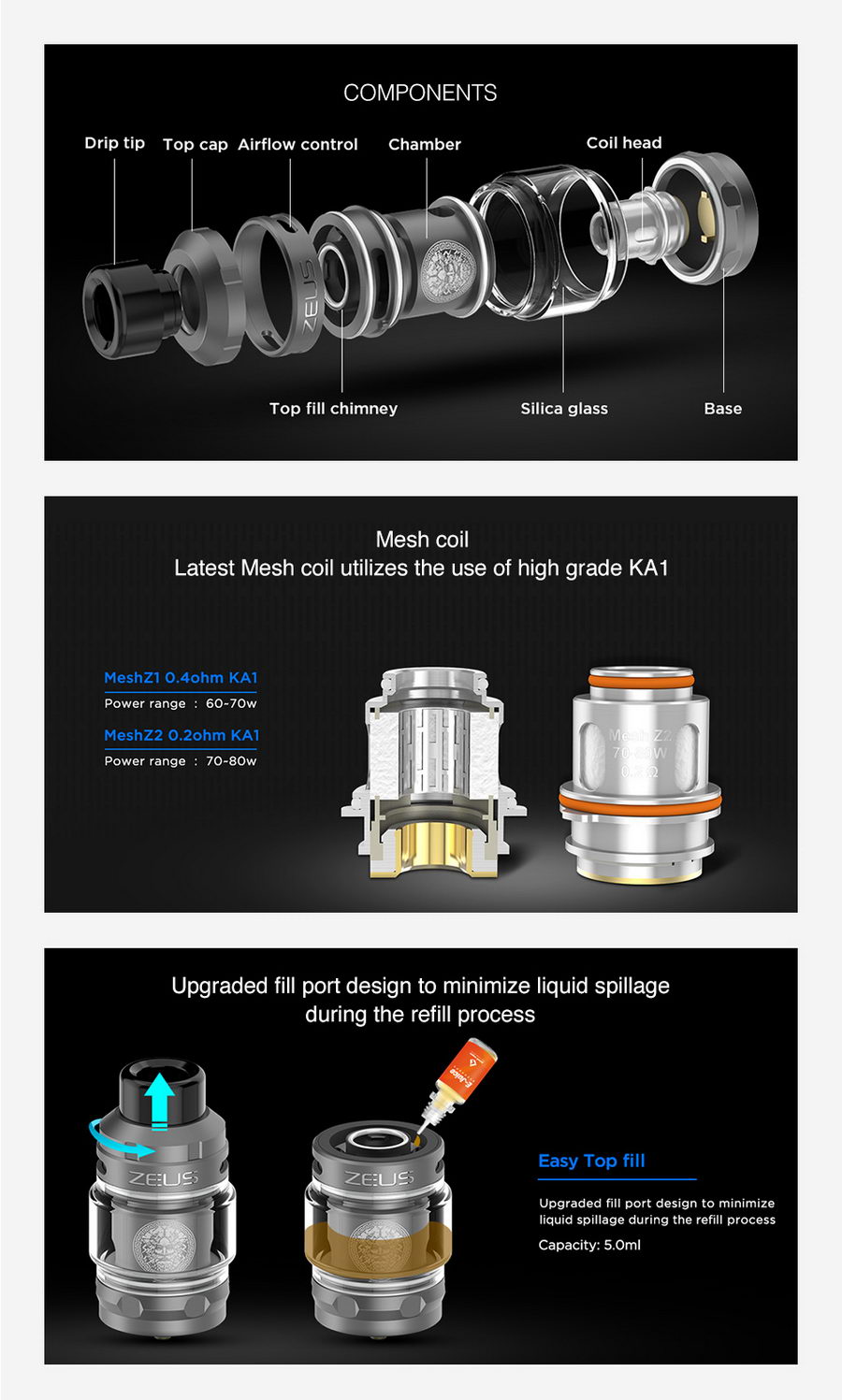 Kapacitet ovih tankova je na Zeus Subohm atomizeru manji za 0.5ml nego što je navedeno za Zeus Dual i Zeus X, zbog drugačijih dimenzija komore.
