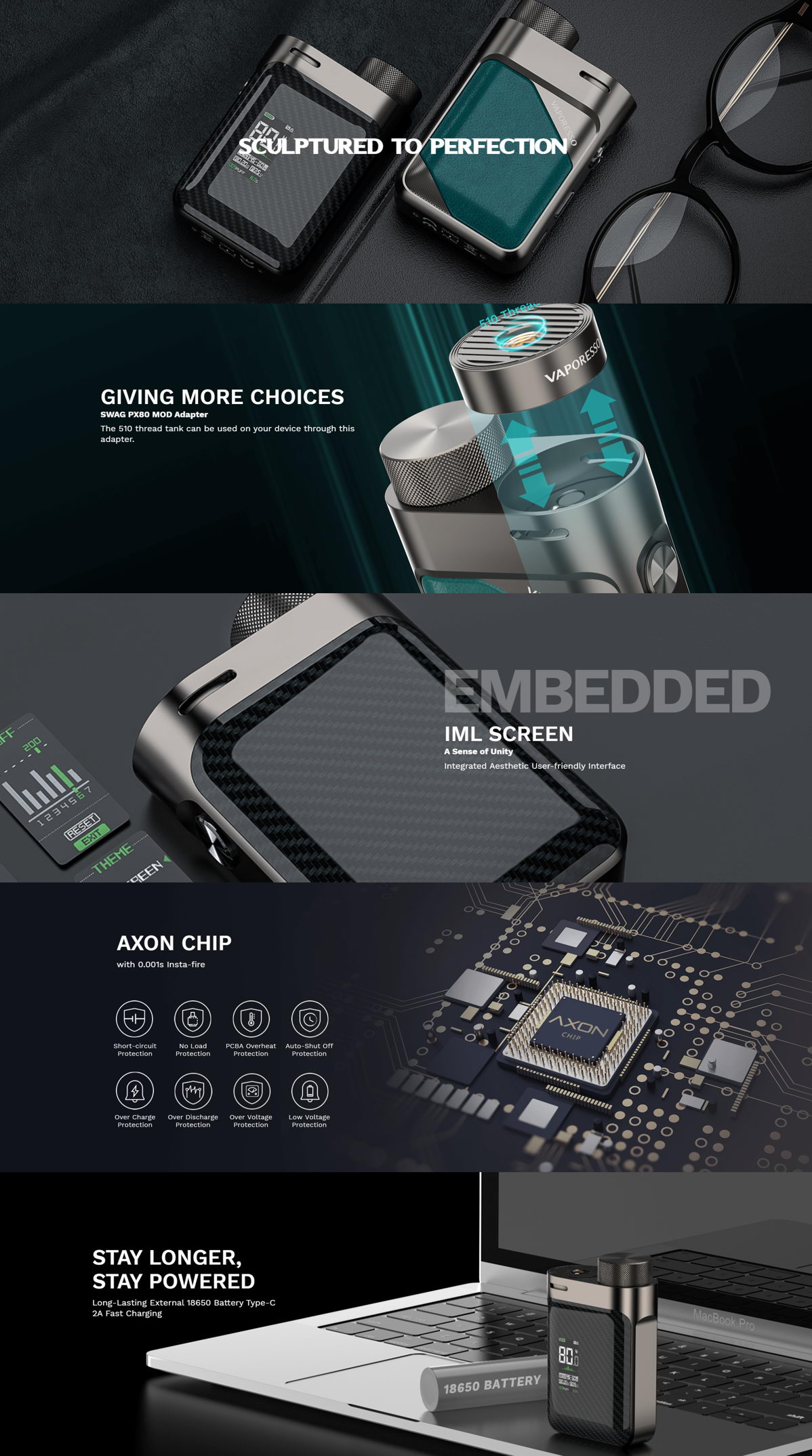 Rad Swag PX80 uređaja kontroliše poznati AXON elektronski čip iz Vaporessa. Ovaj čip krasi pouzdanost i stabilnost u radu, uz nekoliko interesantnih i korisnih rešenja.