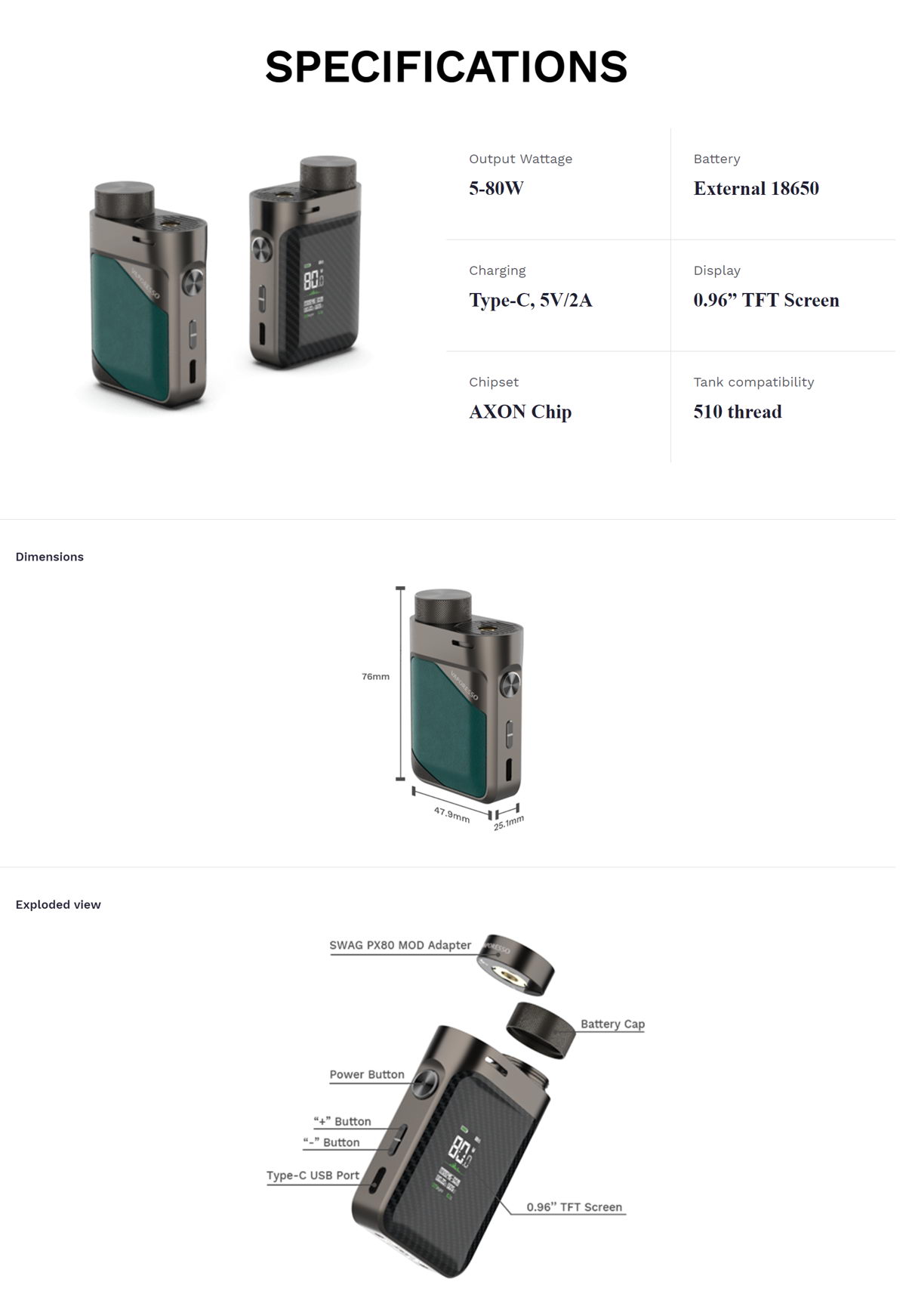 Nakon velike popularnosti Swag PX80 POD mod e-cigarete, Vaporesso nam predstavlja i samo mod iz ovog kompleta. Veoma malih dimenzija i simpatičnog dizajna, predstavlja dobar izbor za korisnike koji traže jednostavnu i kvalitetnu bateriju što manjih gabarita.